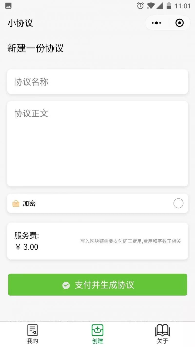也正因为这份好奇心,5月9日,一款名为“小协议”的区块链小程序即使是以很低调的方式上线,还是引起了极大的关注。微信小程序小协议给出的方案非常便捷,输入协议的标题和内容,选择是否加密存储协议内容,支付3块多的服务费,这份协议就生成了,然后微信发送给乙方,乙方同意之后,这份协议就会被写入以太坊网络,无法篡改。小协议声称只需使用3分钟,你就能创建一份不可篡改的协议,微信唯一ID和区块链技术,保证内容真实可信,双方身份可靠。资深律师合作,随时提供电子证据保全。