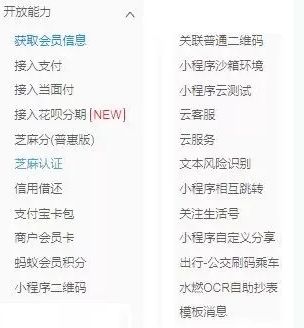 从支付宝的接口不难看出,支付宝小程序主要围绕“交通出行”、“财富管理”、“便民生活”、“政务效力”这几个场景的运用去开展。