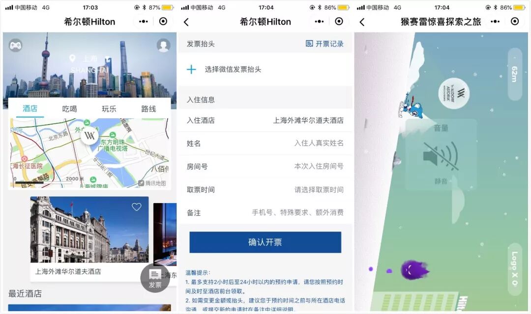 通过对几家酒店小程序的观察试用,势力君还发现,酒店可以通过小程序为客人提供更多个性化服务。在服务标准化的基础上,酒店小程序可以根据客户需求以及自身的营销需求推出更多个性化服务功能,比如会员预订、电子现金、预约开发票、线上商城等,帮助酒店实现更细致的服务,同时也能提升用户满意度。