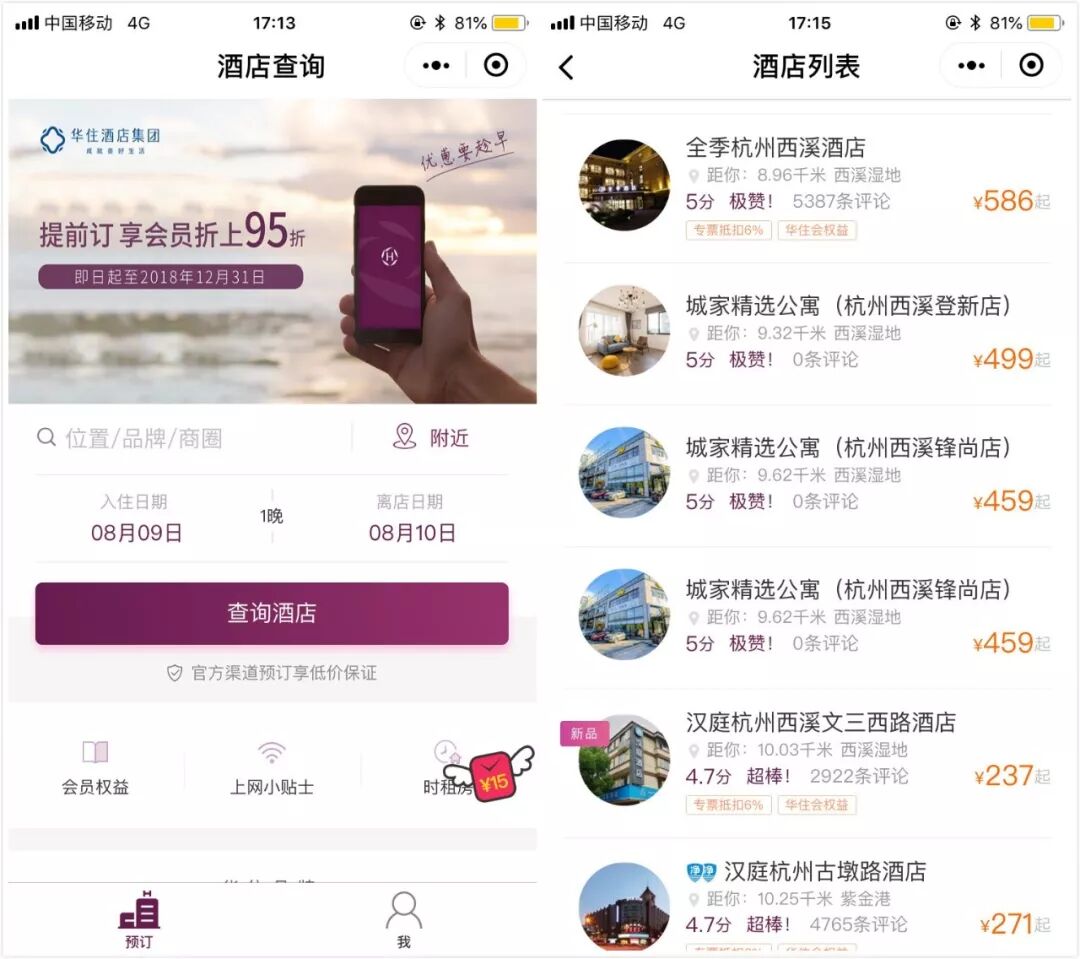 对于大部分人而言,只有两种情况需要入住酒店,出差或者旅行,两者都不是高频需求,从用户体验的角度来说,特意下载App不仅占用手机内存,用户的操作模式也过重,而小程序恰好解决了这个问题。而即使是常年出差的商旅客人或者经常出门旅行的旅游爱好者,也会有自己偏爱的酒店品牌,此时相对于OTA平台和官网,微信上随手一搜就能使用、用完即走的小程序显然更符合用户的使用场景。