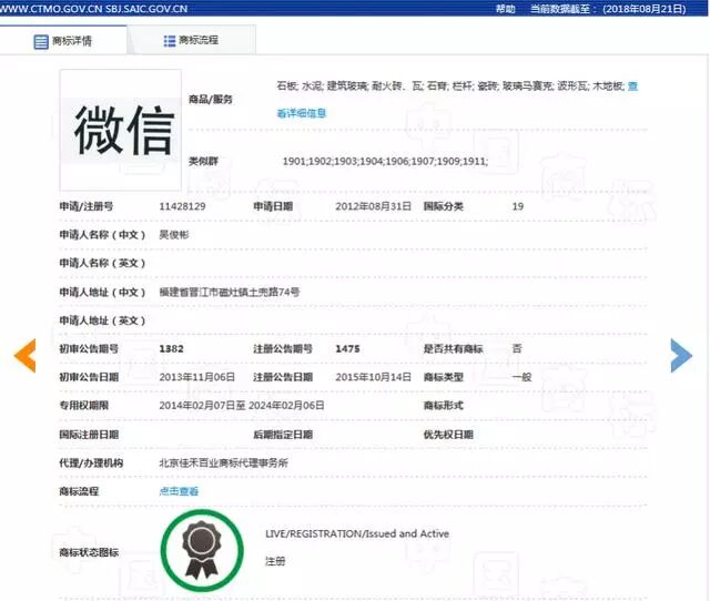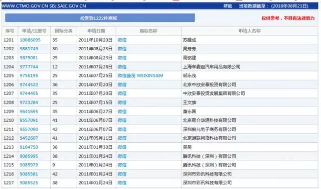 事实上,截止目前,腾讯公司仍有多枚“微信”商标流落在外。
