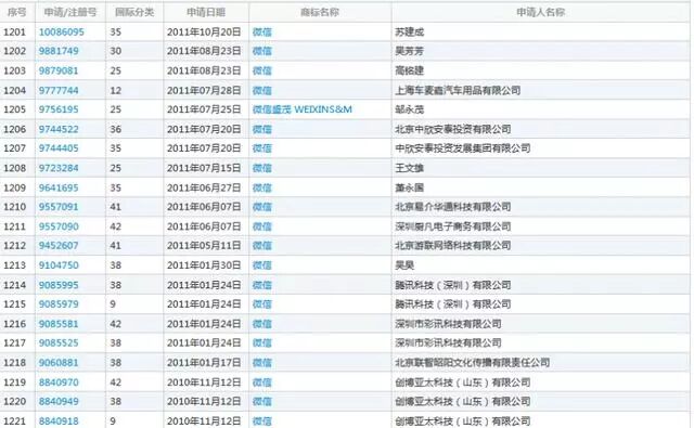 由于当初没有选择一口气45类全类别注册“微信”商标,待腾讯公司反应过来时,多家企业及个人已经抢先注册了多个类别的“微信”商标。