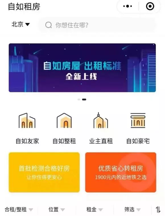 小程序也被引入到了房屋租赁行业。租房行业大佬自如最近上线小程序“自如ziroom”,已开通北京、上海、深圳、杭州、南京、成都、武汉、广州、天津9个城市。小程序的功能也在APP基础上做了优化,可根据不同城市特点推荐不同风格的房屋,比如地铁房、电梯房、热门地点房源等。